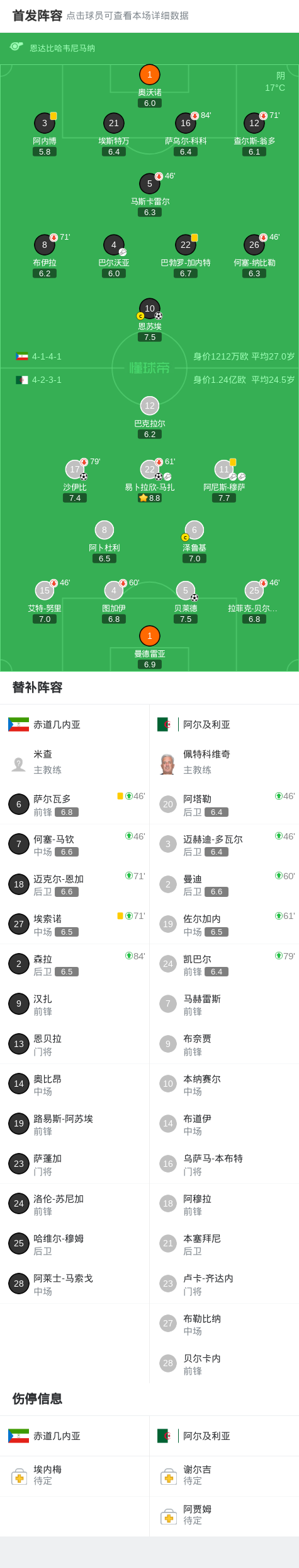北京时间1月1日,非洲国家杯小组赛第三轮展开较量,赤道几内亚迎战阿尔及利亚。比赛中,阿尔及利亚率先打破僵局,贝莱德接阿尼斯-穆萨的助攻率先破门。随后球队攻势延续,易卜拉欣-马扎送出妙传,沙伊比推射得手扩大领先优势。不久后,阿尼斯-穆萨再次贡献助攻,帮助易卜拉欣-马扎攻入一球,进一步巩固比分。下半场,赤道几内亚展开反击,巴尔沃亚助攻恩苏埃扳回一城。此后双方均未能改写比分,最终全场结束,赤道几内亚1-3不敌阿尔及利亚。
