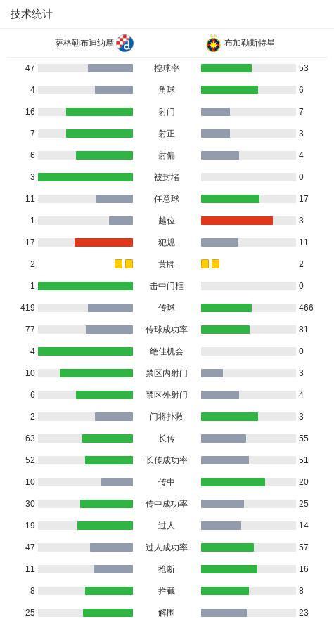 北京时间1月23日,欧足联欧洲联赛联赛阶段第7轮,萨格勒布迪纳摩迎战布加勒斯特星。比赛开局阶段,加莱希奇送出助攻,巴克拉尔破门得分,为萨格勒布迪纳摩取得领先。随后阿伯-霍查完成助攻,贝廖接应建功,进一步扩大比分优势。布加勒斯特星由齐索蒂助攻比尔利贾攻入一球,暂时止住颓势。下半场,米希奇送出传球,贝廖再度破门,完成个人第二次得分。临近结束前,塞尔希-多明格斯助攻库伦诺维奇破门,锁定全场比分。最终,萨格勒布迪纳摩以4比1战胜布加勒斯特星。