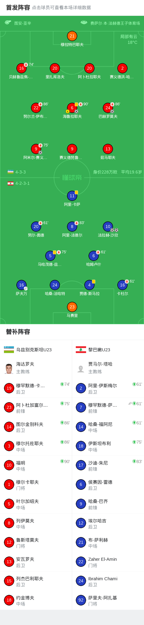 第50分钟,乌兹别克斯坦U23球员海鲁拉耶夫打入一球。